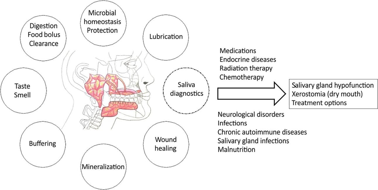 Saliva is an overlooked and underappreciated bodily fluid that is essential to oral- and overall health. Although saliva mostly consists of water, it also contains proteins, ions, and enzymes.